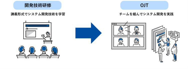 開発技術研修とOJTの2軸に分かれており、開発技術研修ではC#やWebデザイン、Webアプリケーションといったシステム開発の技術を講義形式で「input」します。OJTではチームごとに分かれて、システム開発に1から取り組み、知識を「output」しながら皆で成果物を作り上げていきます。