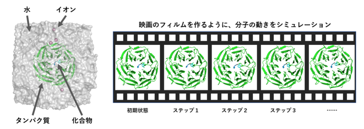 ドッキングシミュレーションでは化合物が特定のタンパク質とどのように結合するかをシミュレーションすることにより、候補化合物の結合性を評価しリード化合物の選定ができます。MD計算では分子レベルで原子の動きを再現し、タンパク質と化合物間の相互作用をより詳細に解析できます。