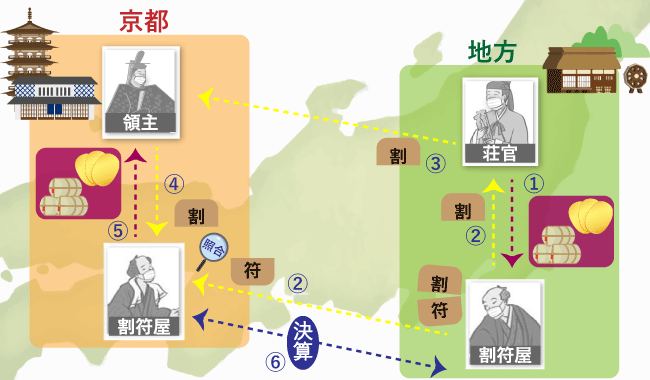 ① 地方の荘官が、地方の割符屋に、米・銭を持ち込み京都への送付を依頼する。