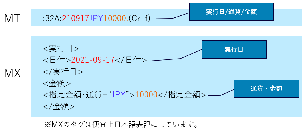 新フォーマットは、MX(XMLベースのMessage Type)と呼ばれ、SWIFT自身がメッセージ標準を開発したISO20022に準拠しています。現行フォーマットであるMT (Message Type)とMXフォーマットのサンプルを下の図に示しました。MTをデータ処理する場合、メッセージテキスト内を検索して「:32A:」のフィールド名を見つけた後、右端にある「改行コード(CrLf)」の前までを取り出し、内容を確認しなければなりません。一方、MXの場合は、それぞれ項目のタグ編集がされているため、プログラム側において、メッセージの内容を分析することなく、簡単に値を取り出せます。