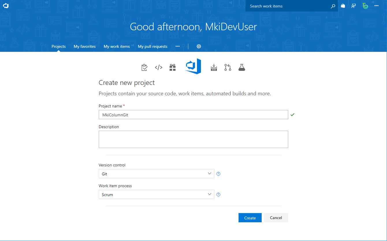 以下項目を選択して「Create」するとVSTSにプロジェクトが作成されます。