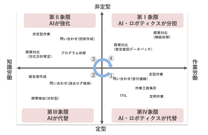 第Ⅳ象限は定型的な作業であり、かつ作業労働であるため、最も自動化しやすい業務と言えます。AIを使わずともRPAで実現できる業務も多くあります。第Ⅲ象限では定型的な作業ですが知識労働に相当する業務であるため、学習を行うことができる人工知能が必要となってきます。第Ⅱ象限、第Ⅰ象限では非定型な作業となるため、難易度はグッとあがります。現在はこの2つの象限の自動化には着手できていませんが、将来的には自動化を実現させたいと考えています。