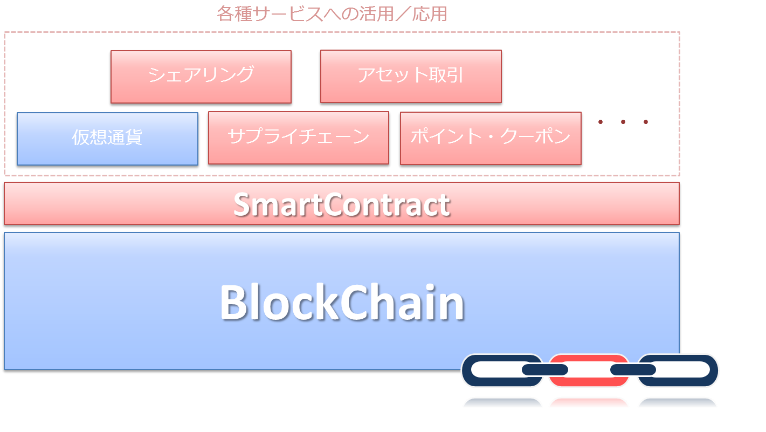スマートコントラクトを扱えるブロックチェーンのプラットフォームは、Ethereum(イーサーリアム)など幾つかありますが、スマートコントラクトの仕組みを用いたビジネスアプリケーションをその上に実装することで、ブロックチェーンの応用領域を広げることが可能になるのです。