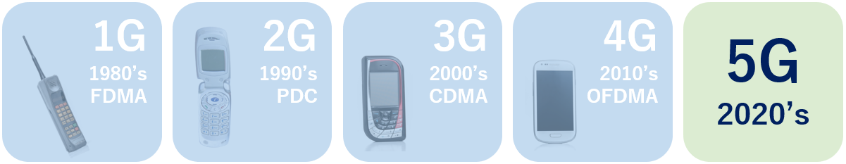 私が社会人になって初めて購入した携帯電話は2G(PDC方式)でまだカメラもついておらずユースケースといえば音声通話のみでしたが、3G(CDMA方式)や4G(OFDMA方式)による周波数利用効率と空間多重化技術の飛躍的向上により、どんどんとデータ転送速度を発展させてきました。