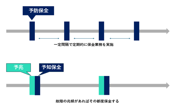 予防保全と予知保全の違いは、点検を実施するタイミングです。予防保全は設備故障の有無に関係なく計画的に点検を実施するのに対して、予知保全は設備故障の兆候を捉えて必要な時に必要な人だけが点検を実施します。