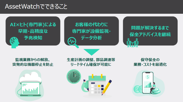 三井情報はAssetWatchを通じて製造プロセス工程における故障の予兆検知や生産性の向上、コスト削減を支援するとともに、生産・製造現場で浮き彫りとなっている具体的な課題を抽出し、より一層お客様に寄り添いながら課題解決に取り組んでまいります。