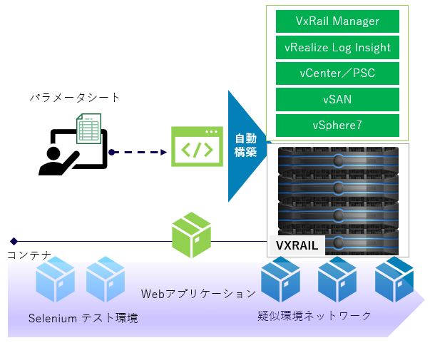 これらのプロセスを自動化するため、構築に必要となる疑似環境ネットワークの準備、自動化管理のWebアプリケーション、正常性とエビデンスを取るためのテスト環境をコンテナ化しています。そのため、いつでも・誰でも・何度でも簡単に構築作業を実践出来るようにしています。