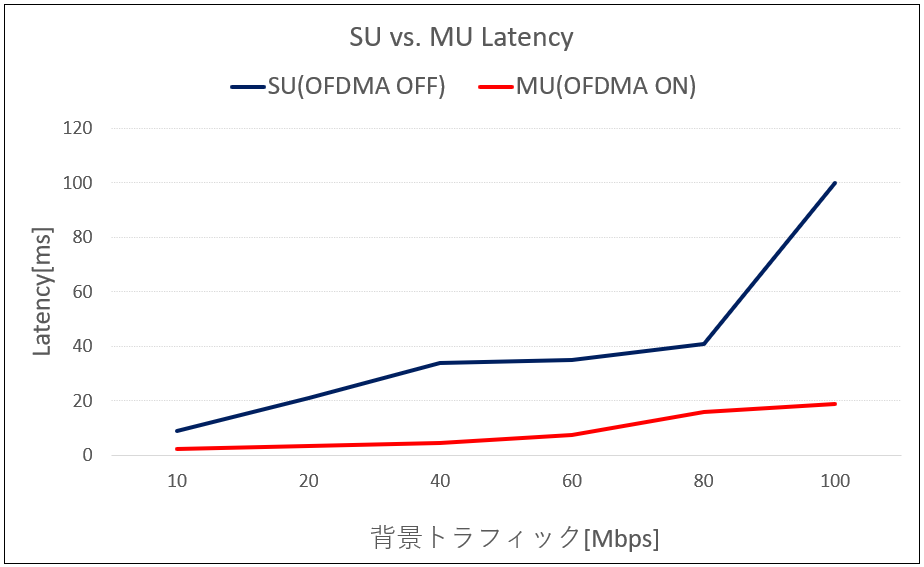 そのトラフィックが流れているなか、OFDMA無効(SU「Single User」:1端末ごとの通信)と、OFDMA有効(MU「Multi User」:複数端末が同時通信)で通信遅延の違いを確認します。