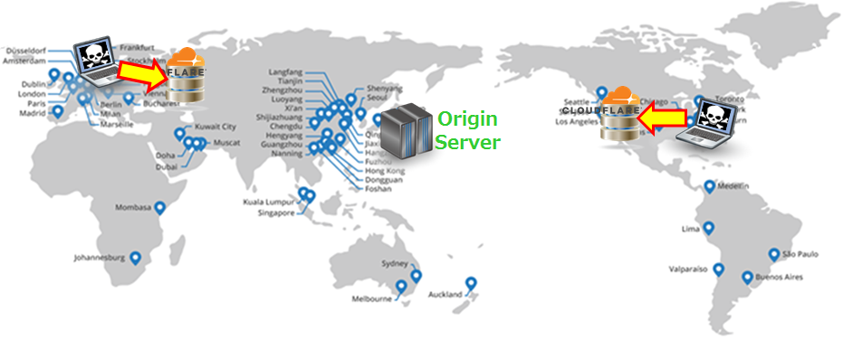 数十~数百Gbpsの攻撃も珍しくないため、オンプレミスのDDoS対策製品の場合は契約回線が攻撃パケットで埋め尽くされる問題に対して無力ですが、上記の対策なら安心です。ミサイル防衛と同じで、攻撃はできるだけ早く打ち落としたいですよね。ミサイル防衛の世界ではTHAADミサイルやSM-3といった迎撃ミサイルで守る訳ですが、Cloudflareの場合はIP Anycastというテクノロジーを採用することで、送信元の近くのエッジサーバへトラフィックを誘導し、オリジンサーバやその接続回線を完全に保護します。