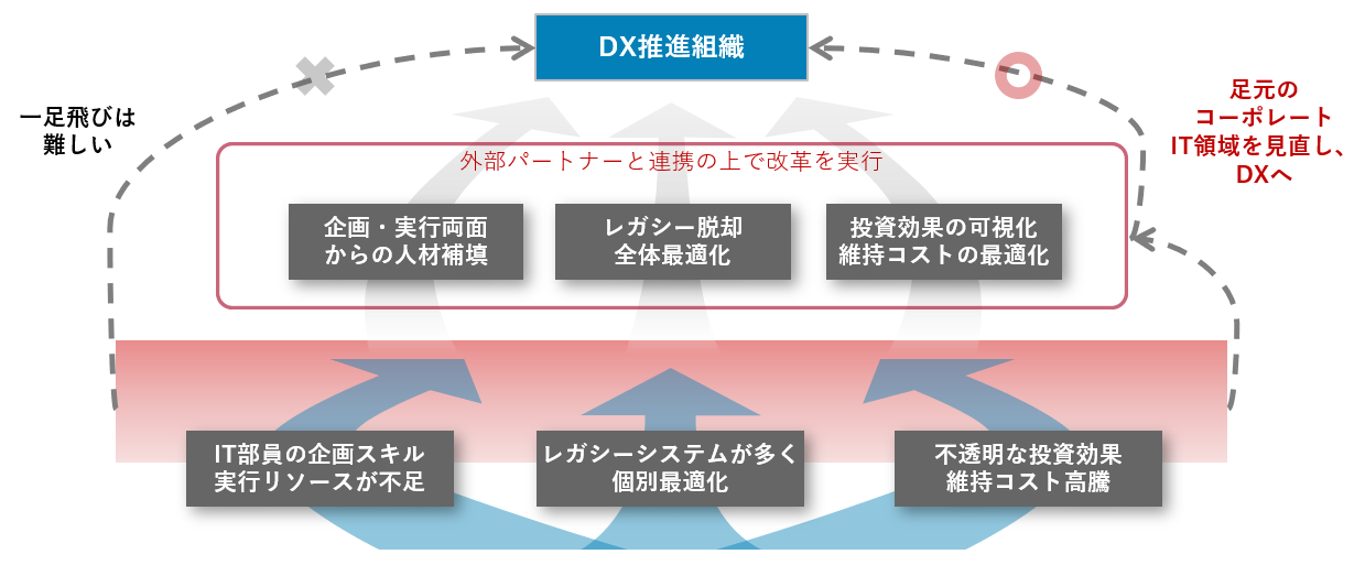 さて一方で、自社IT人材とIT資産はどのような状況でしょうか。一口にDX推進といっても既存のリソースでやり切れるでしょうか。現実面としてはスキル・リソース面で人材を補強する必要もあり、またレガシー化したシステム群を一から見直し、変化に強いシステム環境に移行していくなど、まずは “既存ITのヒトモノカネ”(コーポレートIT)の改善に対して腰を据えた対応をしていかなければならない企業が殆どではないでしょうか。足元が整備できていない状況で上辺だけのAIやIoTの導入を繰り返し、PoC疲れに陥ってしまう企業の例もあります。
