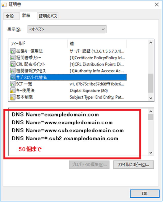 Subject Alternative Nameに設定できるホスト名は1階層を超えるサブドメインを設定可能です。上記③で対象外であったwww.sub.exampledomain.comを含めることができます。