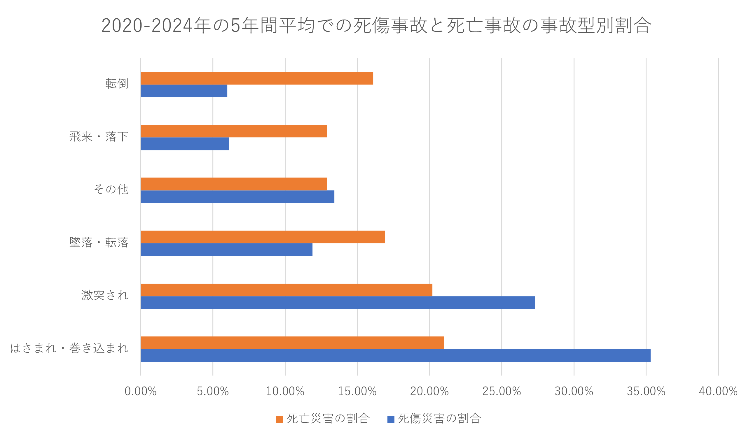 一般社団法人日本産業車両協会「フォークリフトに起因する労働災害の発生状況-厚生労働省労働災害統計より-」を参照して、2020-2024年の5年間平均での死傷事故と死亡事故の事故型別割合をご紹介します。「はさまれ・巻き込まれ」及び「激突され」の合計の死傷災害の割合は全体の62.6%であり、死亡災害についても41.2%と高い数値となっています。