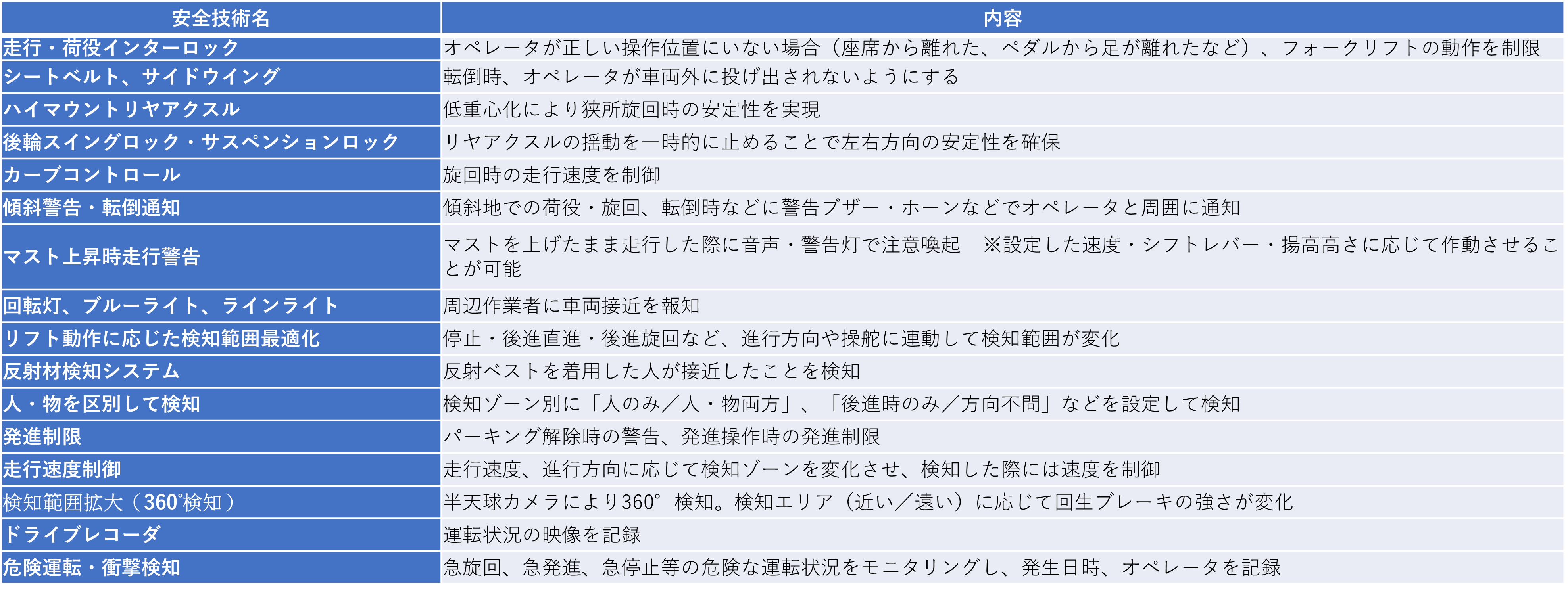 フォークリフトメーカによる安全技術では、主に「危険・異常動作の検知→車両の動作を制御」というタイプの安全技術が多い印象を受けました。