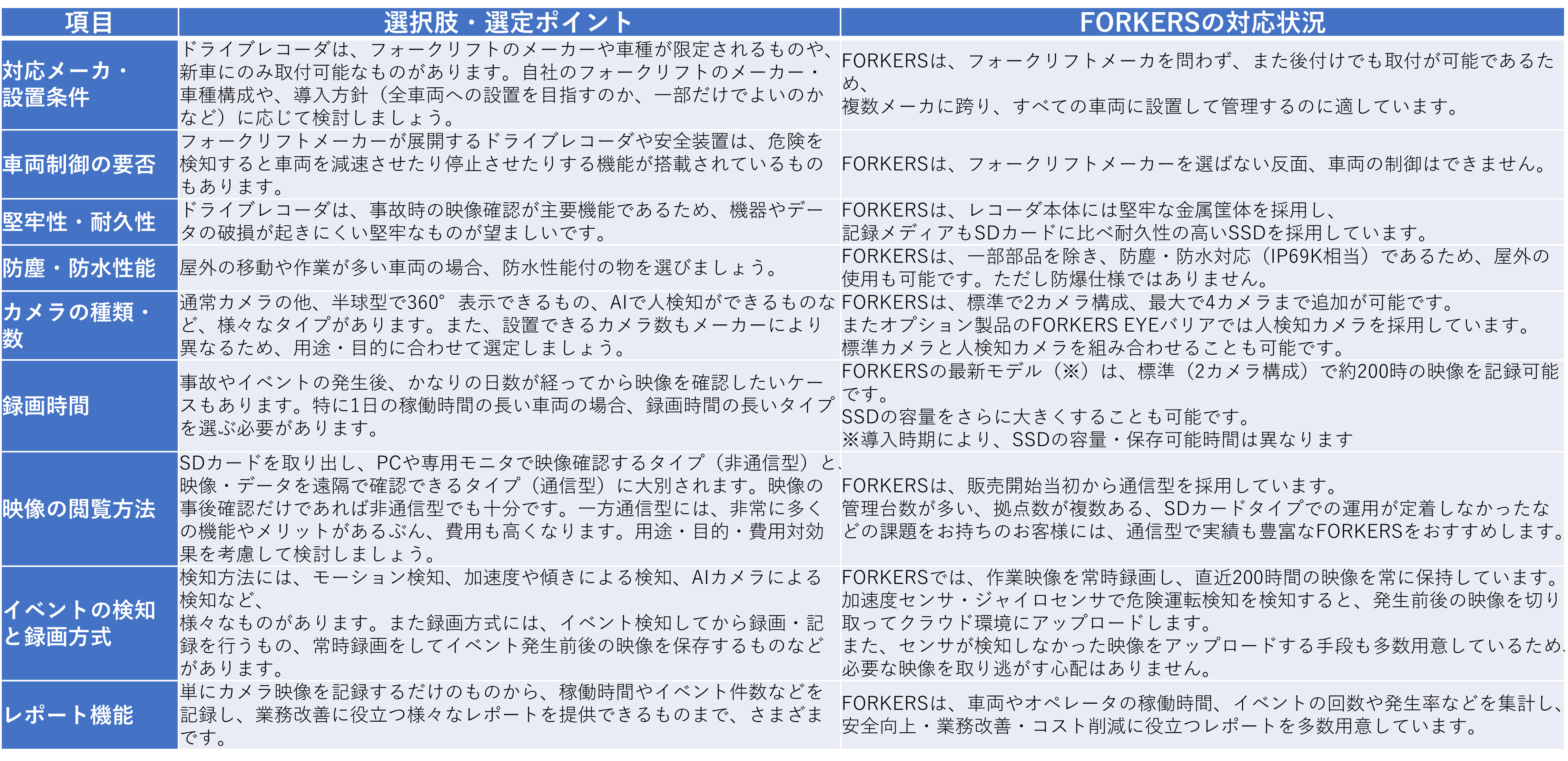 フォークリフト用のドライブレコーダは、機能も価格も様々です。お客様が求める機能を有しているかが重要な選定ポイントになります。