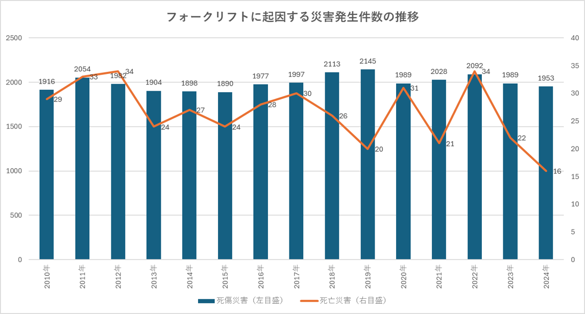 一般社団法人日本産業車両協会によると、フォークリフトに起因する死傷事故は毎年2,000件前後、死亡事故は毎年20~30人程度で推移しています。直近3年(2022年~2024年)では死傷事故、死亡事故とも減少傾向、特に2024年の死亡事故は16名と、2010年以降では最も少ない人数となりました。