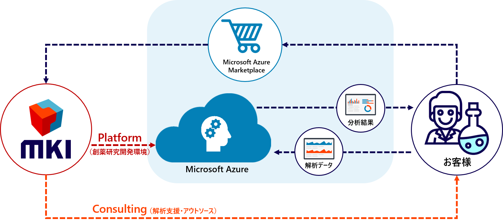 日本は世界でも有数の新薬開発国であり、厚生労働省「医薬品産業強化総合戦略」※2でも創薬大国の実現を目指して様々な戦略が検討されています。計算創薬に欠かすことのできないハイパフォーマンスコンピューティング(以下 HPC)は創薬プロセスの効率化において重要な役割を担っています。昨今、HPC導入のネックとなっていた費用削減、短期導入の手段として、クラウドでのHPC利用が注目されています。MKIは従前より製薬各社および公的研究機関に対して、クラウド上で計算創薬環境やバイオインフォマティクス解析環境を提供してきました。今回新しく提供を開始する本サービスは、様々なお客様を通してMKIが蓄積してきたナレッジを集約させ、創薬研究に取り組む全ての企業や研究機関が汎用的に利用できるようにパッケージ化したものです。パッケージ内には分子シミュレーションやドッキングシミュレーション、NGS解析等の計算創薬基盤を提供する“MKI-DryLab::Platform”と、解析のアウトソースおよびバイオ医薬品や新規モダリティ開発支援等これまでMKIが蓄積した創薬のナレッジを活かしてお客様を支援する“MKI-DryLab::Consulting”を用意しており、計算創薬に関する知見が社内にない場合でも安心して利用できます。また、すでにMicrosoft Azureを利用している場合は、既存環境上へセットアップすることも可能です。MKIでは本サービスを月額25万円~提供しており、試験的に利用されたいお客様にはPoC/トライアルのご相談も承ります。