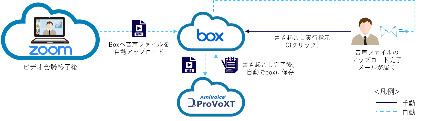 昨今、感染症等の拡大防止やワークライフバランスを実現する働き方改革のために、テレワーク勤務やコミュニケーションツールを利用した会議が推奨されています。企業では、それらの調達や運用にかかる手間の削減や、誰でも簡単に利用できるサービスやツールの選定が求められています。かかる状況を受け提供を開始した本サービスは3つのクラウドサービス「Zoom」「Box」「ProVoXT」と利用者向けヘルプデスク等のテレワークに必要な環境を一式で提供しています。ユーザから複数のクラウドサービスの利用に対してシームレスな操作、特にビデオ会議後の音声データのBox(容量無制限クラウドストレージ)への自動保存、文字起こしの自動化を望む声が多く寄せられていました。この度MKIでは、会議終了後の音声データのアップロード作業を自動化し、ユーザが3クリックで文字起こしの実行指示ができる本オプションの提供を開始します。本オプションを使うことにより、ユーザは会議後のアップロード忘れによる共有遅延が防止でき、音声データのアップロード後は文字起こし実行中でも音声データの再生ができます。本オプションはビデオ会議サービス「Zoom」にMKI独自の機能を追加しており、利用には月額600円/IDが別途かかります(※)。なお、本オプションは本サービスでビデオ会議ツールに「Zoom」を選択されているユーザ向けです。