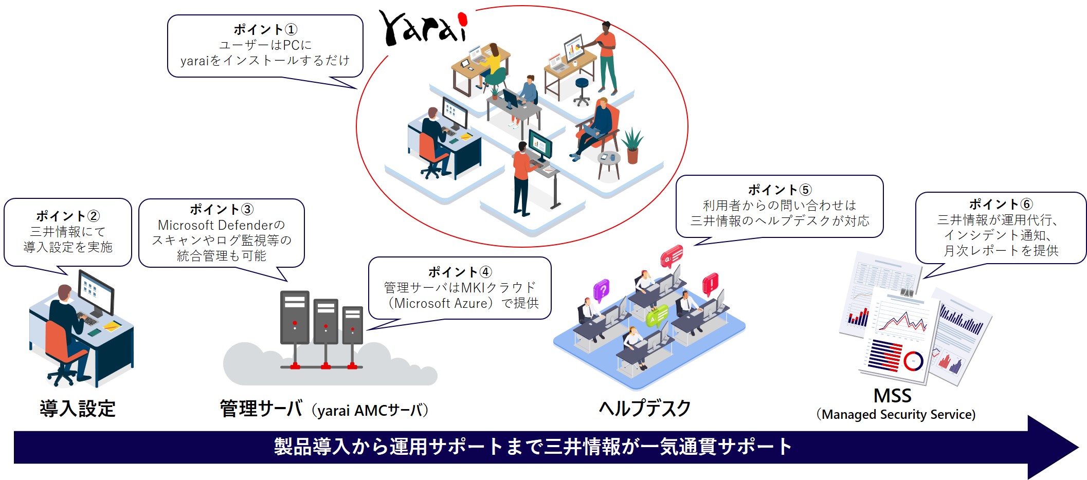 昨今のコロナ禍に伴い、国内企業ではテレワーク導入が加速し、従業員が社外から社内ネットワークにある情報資産やクラウドサービスを利用する機会が増えています。企業は多様な働き方の実現に向けて社内ネットワークやPCにセキュリティ製品を導入していますが、巧妙かつ多様化する最新のサイバー攻撃を検知できないケースもあります。そのため、近年では「ゼロトラスト」※2を前提としたセキュリティ対策が普及し、サイバー攻撃をいつ、どこで受けても検知と対応が可能なEDR機能をPCに導入する企業が増えています。しかし、最小ライセンス数や情報システム部門担当者不足を理由に中小企業や中堅企業における導入は少なく、その隙を突いたサプライチェーン攻撃※3が増えています。かかる状況を受け、三井情報ではEDR製品の導入および運用にかかる負担を軽減する本サービスを提供します。本サービスではyaraiの利用に必要な管理サーバの構築からインシデント通知・月次レポートを含む運用代行を提供し、企業は従業員のPCにyaraiをインストールするだけでEDR機能を利用することができます。
