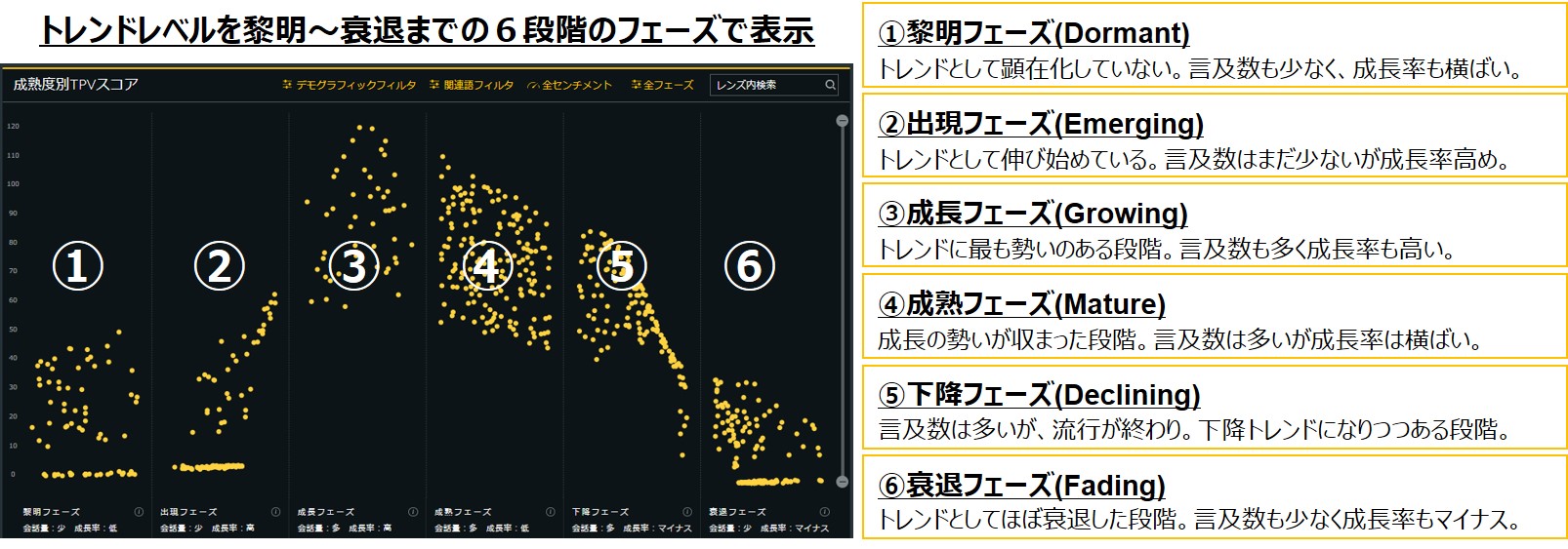 三井情報株式会社(本社:東京都港区、代表取締役社長:浅野 謙吾、以下:三井情報)は、Black Swan Data Limited(本社:英国 ロンドン、CEO:Steve King)が提供する「トレンドスコープ(Trendscope)」で、トレンド予兆を分析できるカテゴリとして新たに「オーラルケア」を追加しました。「トレンドスコープ」はSNSやオンライン情報からソーシャル上の仮想世論をAIで作り出し、消費者の予兆行動を可視化するSaaS型のデータ分析プラットフォームです。企業の商品開発またはマーケティング担当者は「トレンドスコープ」で得られる予兆行動データに基づいた洞察から、「流行の兆し」があるテーマ・素材・ベネフィット(*1)等を見つけ、新規事業開発や新商品企画に活用することができます。