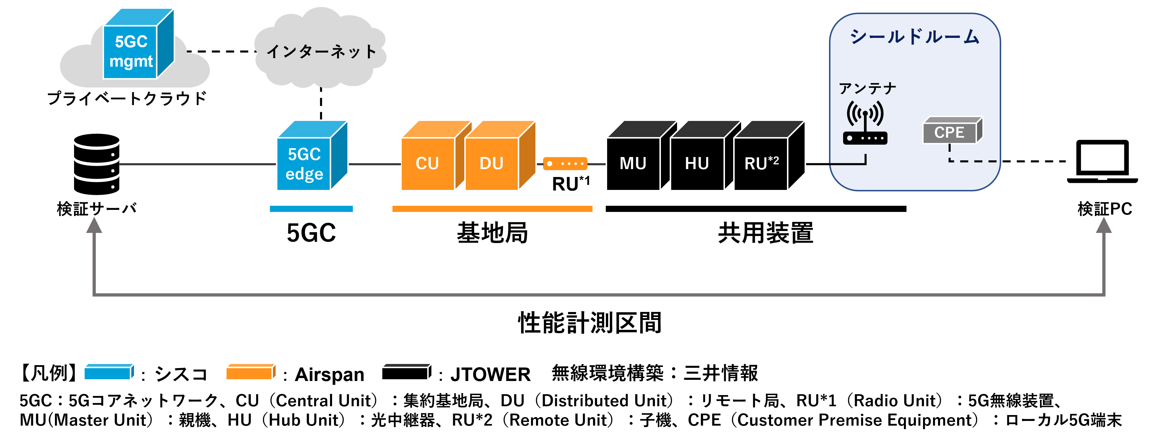 三井情報株式会社(本社:東京都港区、代表取締役社長:浅野 謙吾、以下 三井情報)と、株式会社JTOWER(本社:東京都港区、代表取締役社長:田中 敦史、以下 JTOWER)、シスコシステムズ合同会社(本社:東京都港区、代表執行役員社長:中川 いち朗、以下 シスコ)、エアースパン・ジャパン株式会社(本社:東京都港区、日本代表者:Steven Shipley、以下 Airspan)は、JTOWERが提供する「ローカル5G共用装置」とシスコのハイブリッドクラウド型ローカル5Gコアネットワーク「Cisco Private 5G」、Airspanの基地局で構成したオープンRAN環境での実証実験に成功しました。本取り組みを通じて、4社が協力して日本国内におけるローカル5G設備のインフラシェアリングを促進することで、資材および工事工数の削減、省電力化等により環境負荷を低減するサステナブル(持続可能)なローカル5Gの提供を目指します。