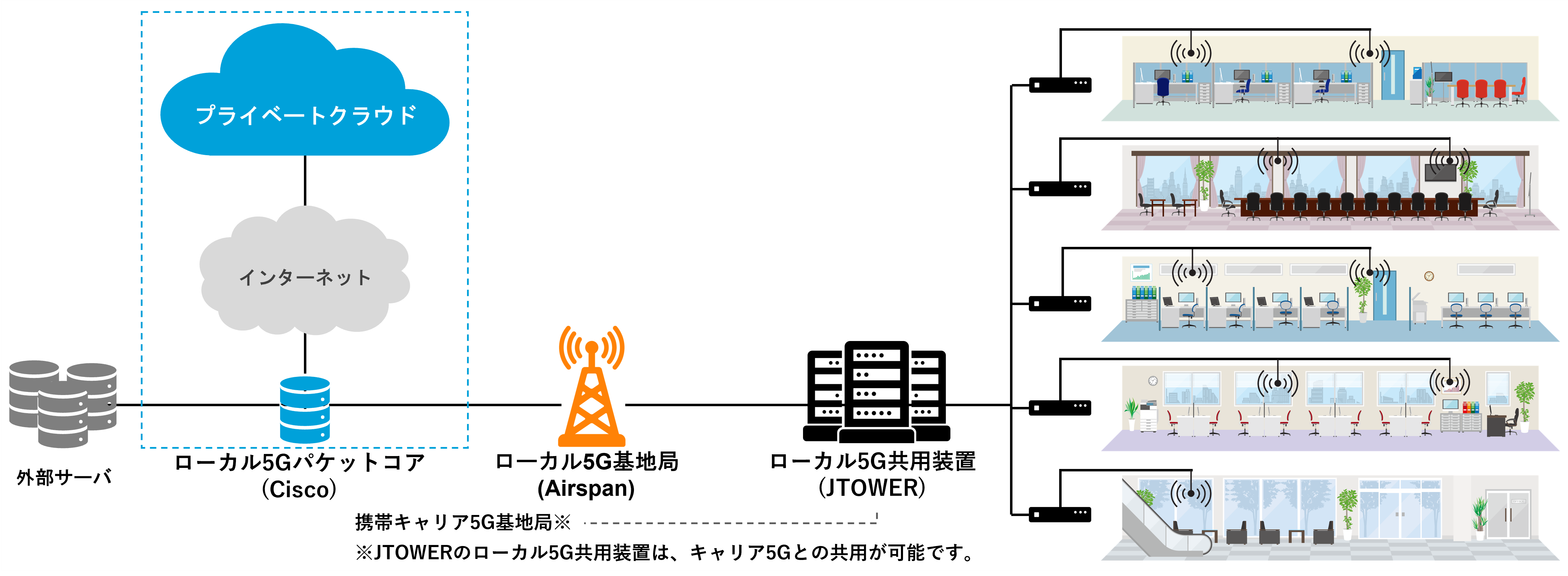 ローカル5Gの導入においては、企業や自治体が各自で通信設備を用意する必要があり、それらにかかる設備投資、装置の設置工事などの投資が導入時の障壁になっています。JTOWERが提供するローカル5G共用装置では、ローカル5G対応の光中継DASにより、基地局から届く電波をデジタル信号に変換し、光ケーブルによって分配することで、ビルや工場などの大規模な建物内や地下空間等において、効率的にネットワーク構築ができます。また、設備の一部は、携帯キャリアや複数のローカル5G事業者で共用することもできるため、省スペース化、省電力化、資材や工事工数の削減などを図ることが可能です。「Cisco Private 5G」も複数のローカル5G事業者で管理機能を共用するハイブリッドクラウド型で提供し、Airspanでは5G基地局を構成するRU(Radio Unit)、DU(Distributed Unit)、CU(Central Unit)を単一筐体で提供する基地局の販売を予定していることから同様の効果が期待でき、企業や自治体のローカル5G導入時の負担をさらに軽減します。