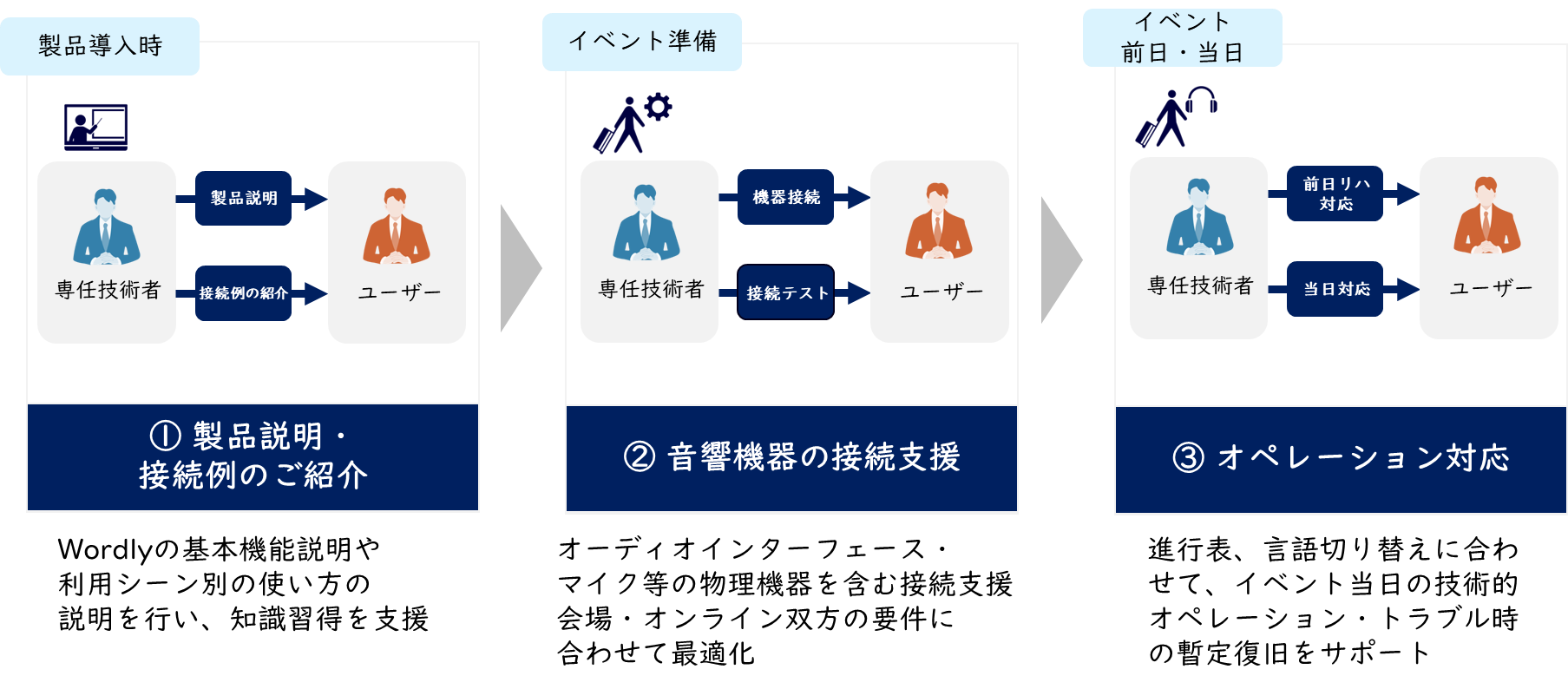 ■本サービスの特長 ① イベントの特性に応じたWordlyの適切な利活用支援 ② 会場・配信環境に応じた技術支援(音響・接続・表示対応) ③ イベント当日の技術運用&トラブル対応サポート |