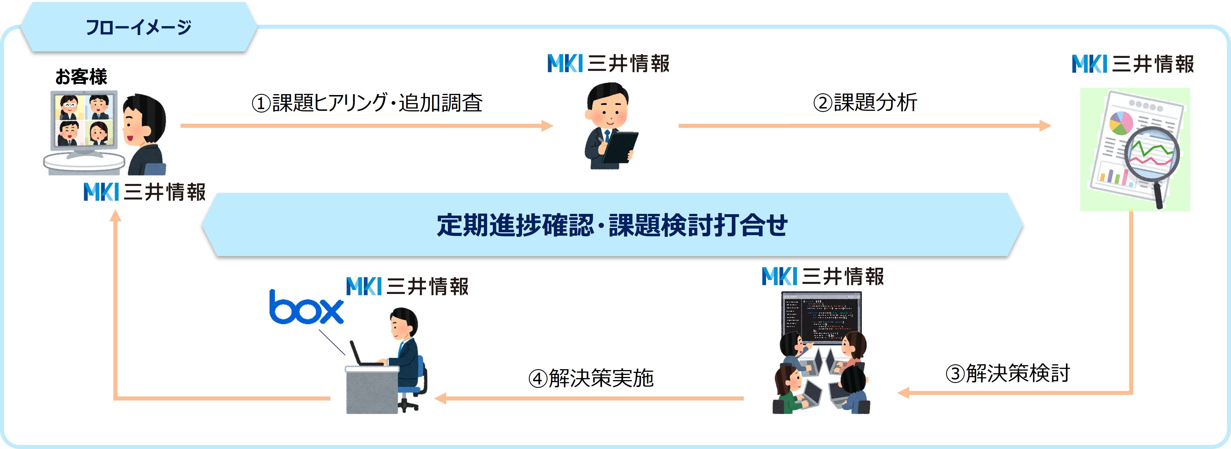 Box課題解決支援サービスでは、ユーザ要望や運用における課題に対して ①課題のヒアリング、②調査・分析、③解決策検討、④解決策実施の一連のプロセスをMKIがご支援致します。