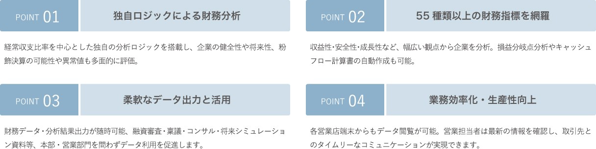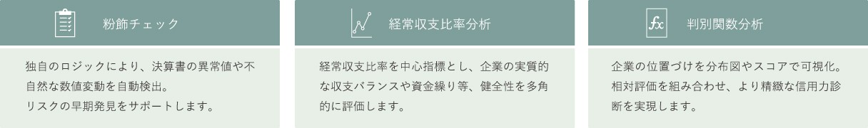 経常収支比率分析を中心に据えた、独自ロジックで企業の信用状態を把握します。