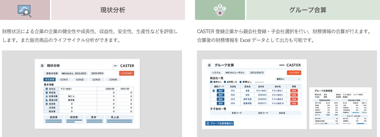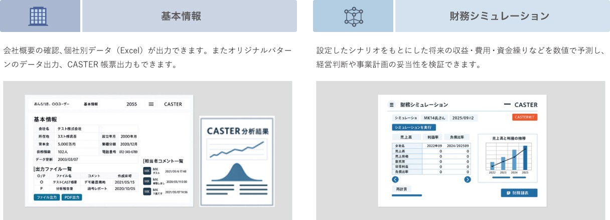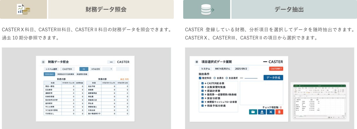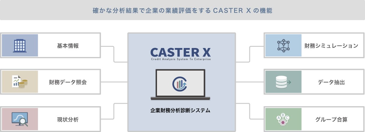 CASTERⅩのWebアプリケーションは、データ抽出が容易にでき、様々な分析、シミュレーションを行うことができ、財務分析の高度化だけでなく、営業活動に役立てることができます。