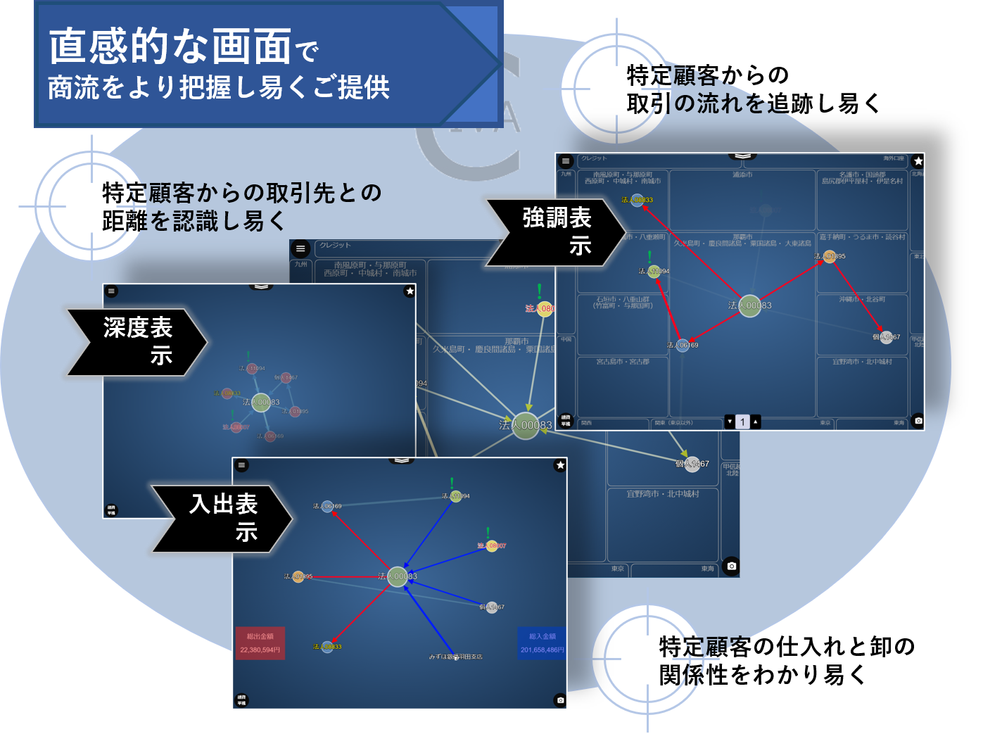 金融機関の持つ口座間の取引情報から、顧客間の取引を繋がりとし商流がビジュアルに表現されることで、新たな気づきを得ることができます。