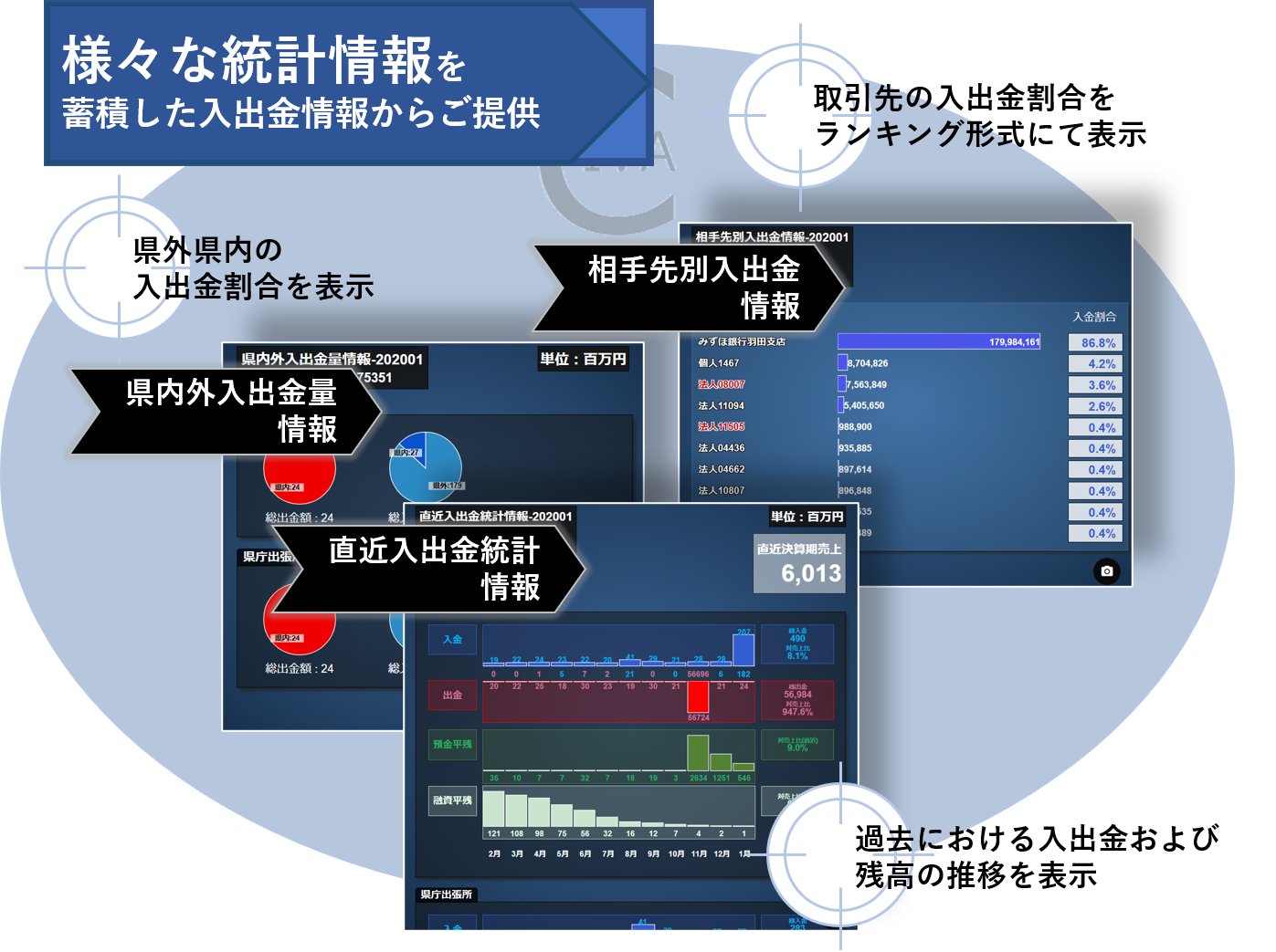 - 入出金の割合からの新規貸し出しや、途上審査の融資判断を行う事ができます。