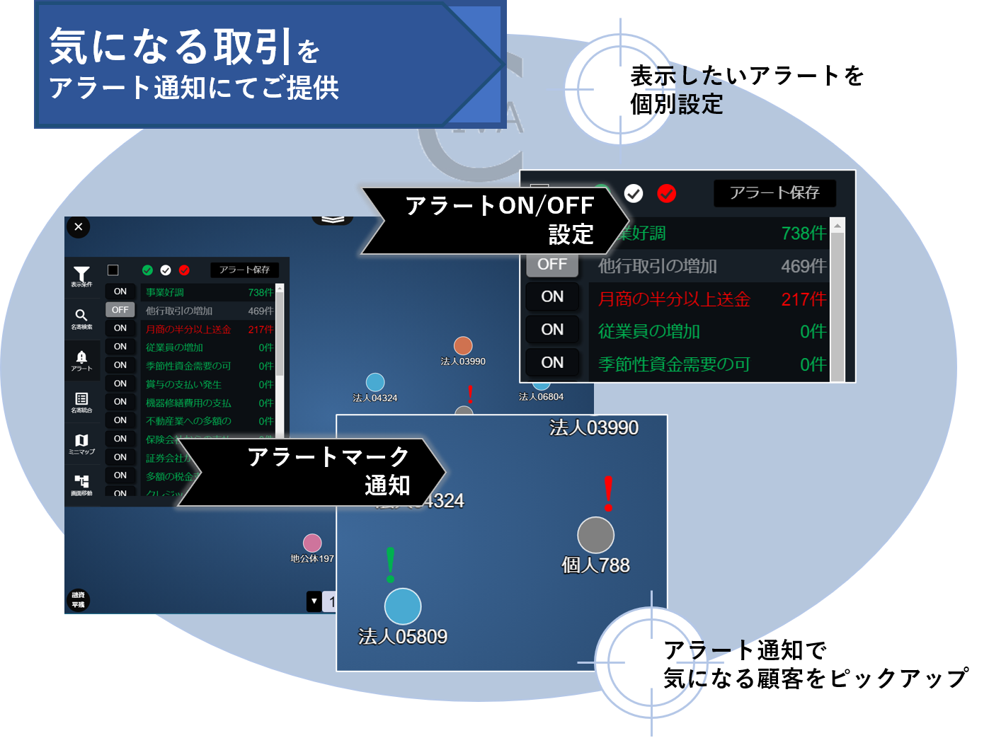 - 商流の突然の変化による、経営状態の変化に気づく事ができます。