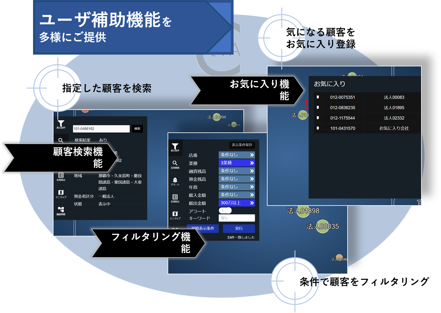 可視化情報をもとに、融資領域、営業領域、企画領域など金融機関内のあらゆる セクションでの情報の利活用を促進します。