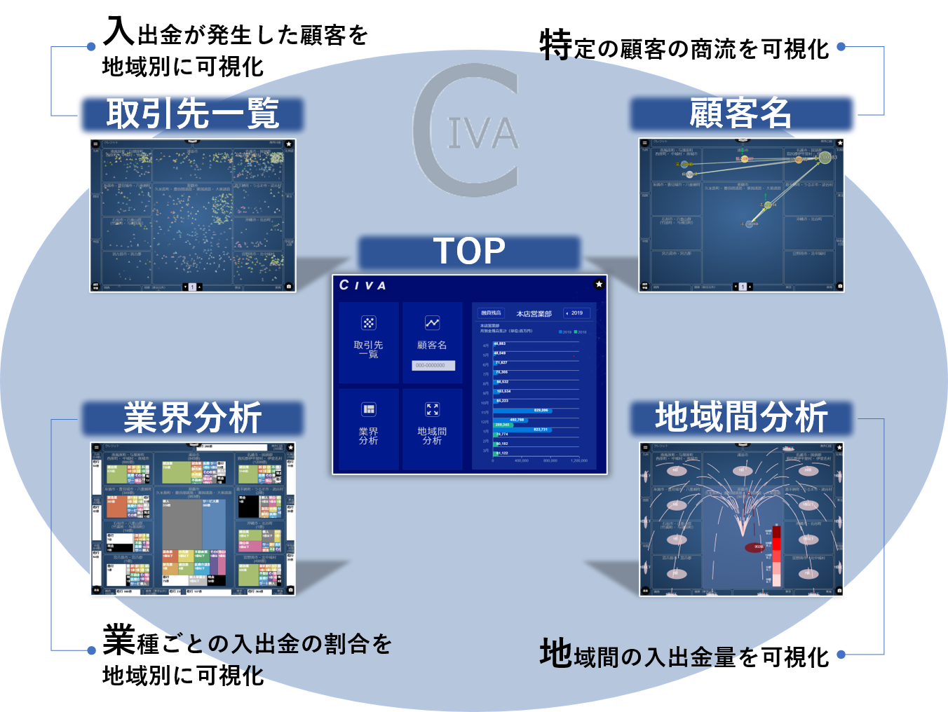 業種・住所・格付・残高などの情報も取り込み、時系列でデータの履歴管理を行うため、商流の変化や入出金と残高の比較推移、業種・地域単位での資金の流れを確認することが可能となります。