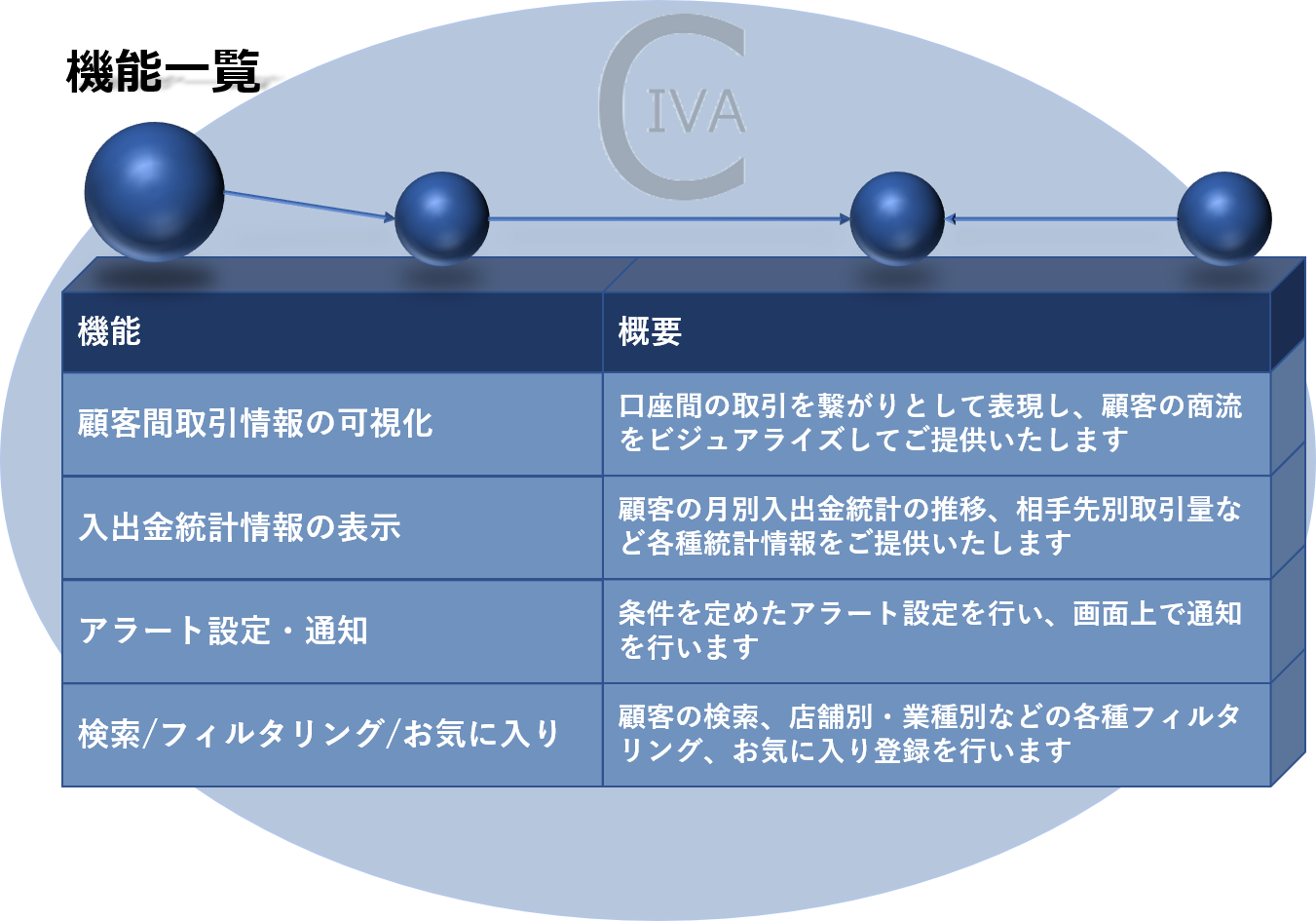 顧客の日々の入出金情報を蓄積し、月単位にて集約した顧客間の取引の流れを可視化して提供するWebアプリケーションです。