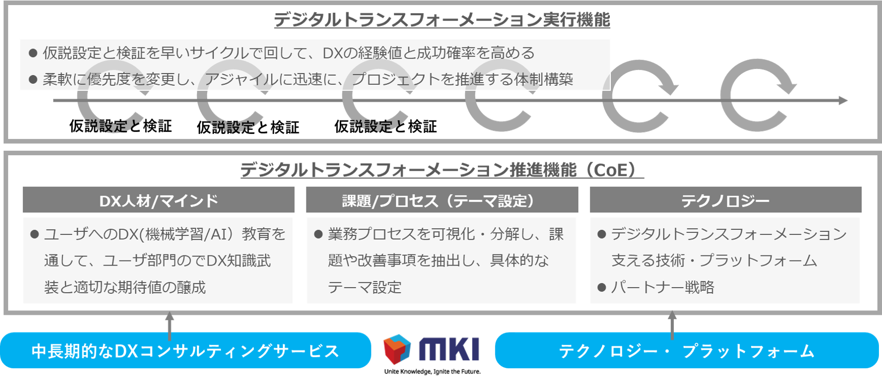 DataRobotは、デジタルトランスフォーメーションの推進に必要な仮説設定や検証を高速にAgileに進めることができる非常に強力なプラットフォームです。MKIはテクノロジーに加え、DXコンサルティングサービスとして企業全体のデジタルトランスフォーメーションを支援します。