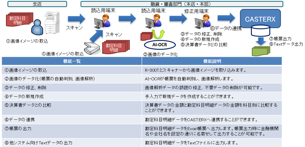 また、勘定科目明細AI-OCR機能で読み取ったデータはCASTER Xへ連携され、帳票や仕分けした帳票の出力や後続システムへの送付が可能です。