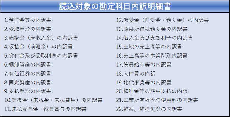 - 読取り対象は、国税庁が指定した様式である勘定科目内訳明細書16帳票22明細です。(手書きを除く)平成31年4月1日以後終了事業年度分の様式と平成30年4月1日以後終了事業年度分の様式に対応しています。