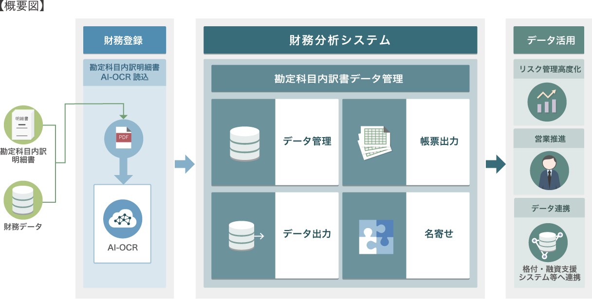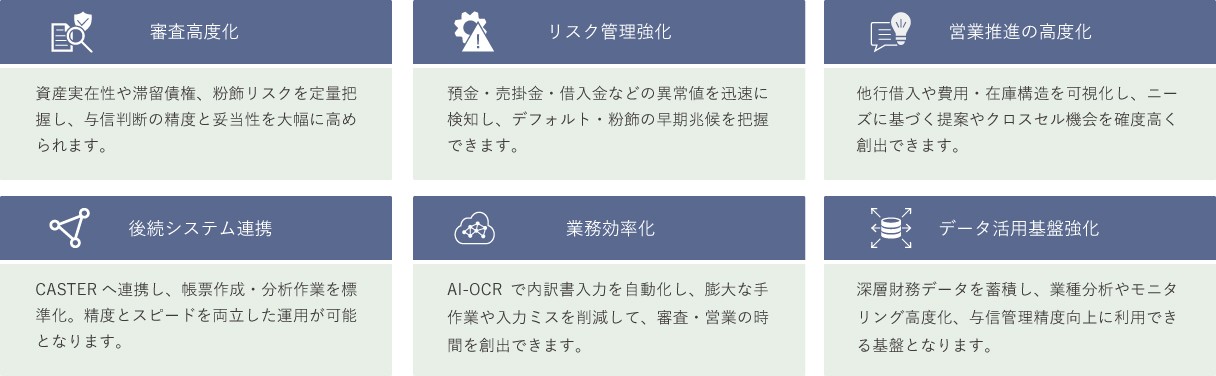 財務5票の限界を、勘定科目内訳で超える。「審査を精緻化し、リスクを減らし、営業を強化し、業務を効率化し、金融機関全体のデータ価値を最大化する」。