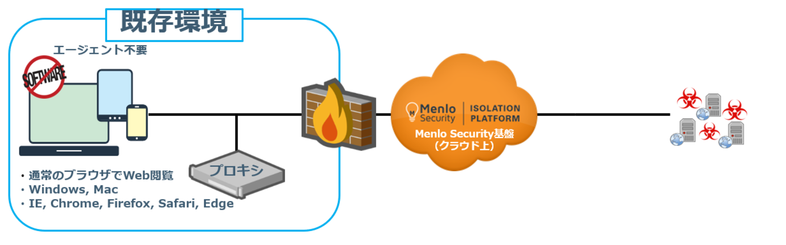 Menlo Securityの利用にあたり、特別なクライアントソフトの設定および導入は不要です。Webアクセスの経路をMenlo Securityに変更するだけで利用することが可能なため、クライアントソフトの管理をする必要もありません。