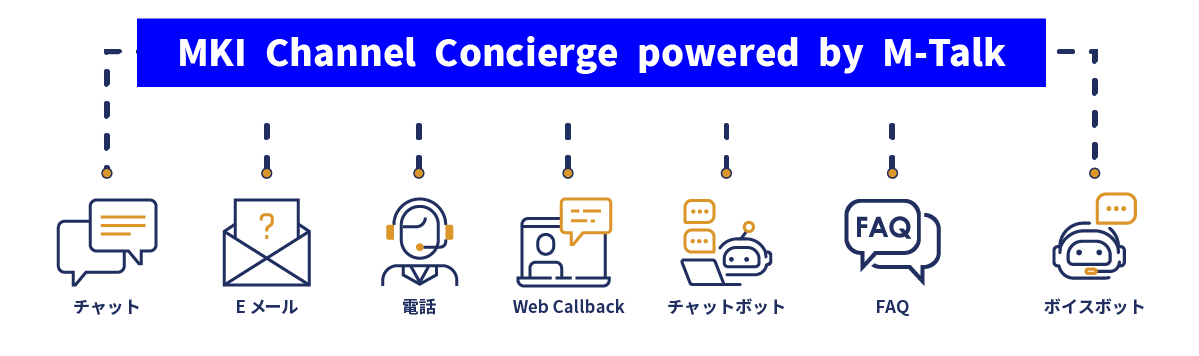 『MKI Channel Concierge powered by M-Talk』は、お客様の目的やコンタクトセンターの応対状況に応じて、最適な問い合わせチャネルが選択できる「チャネル総合案内」を提供します。自己解決を支援するFAQ、待ち時間の少ないチャットボット、オペレーターとのチャット/電話/ビデオ通話といった電話以外の複数チャネルから、お客様が最適な解決チャネルを選べるようご案内。問題解決にかかる時間と手間を最小化、解決率を最大化することで、お客様満足度の向上だけでなく、オペレーターの業務効率化・負担軽減にも貢献します。