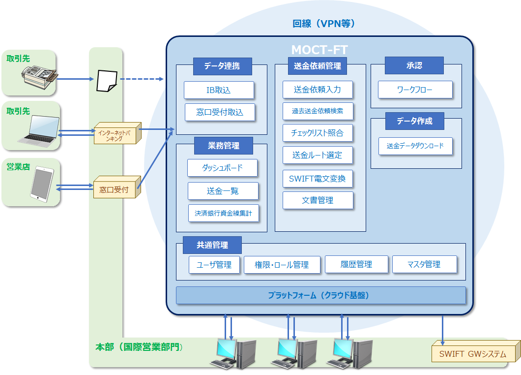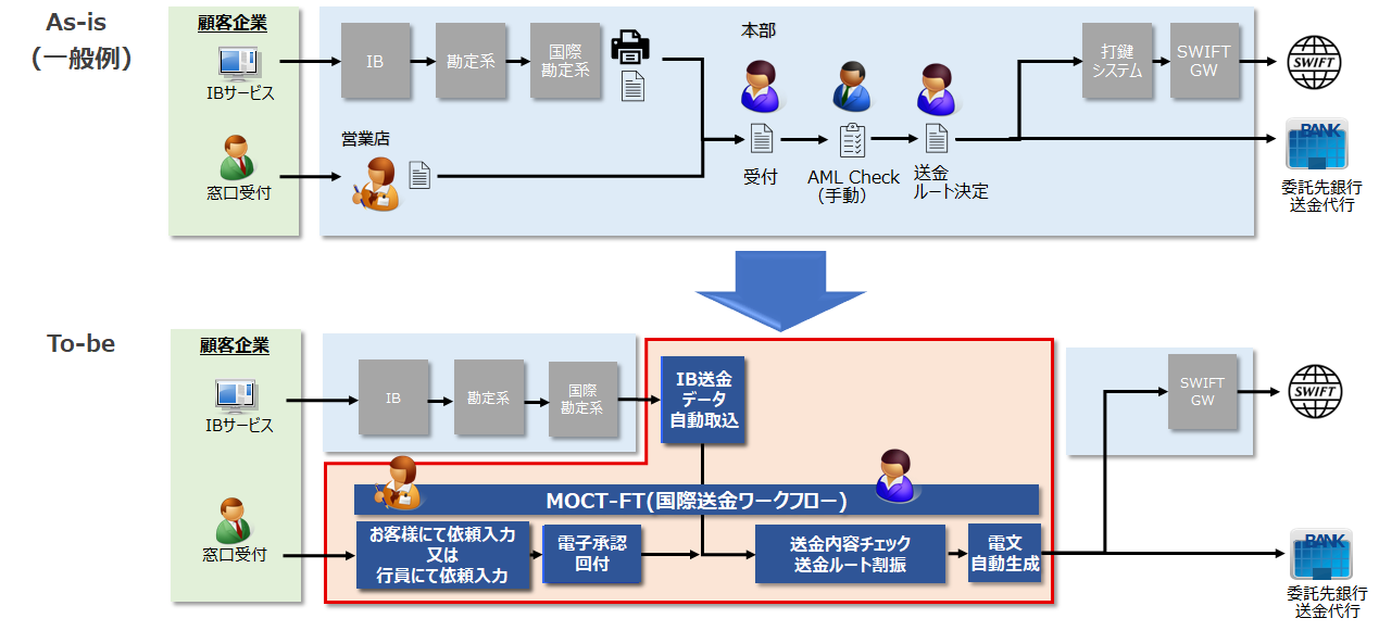 営業店での個人・法人送金依頼受付からSWIFT電文作成までを全てカバーする単一ワークフローシステムは、MOCTのみがパッケージ化を実現しました。
