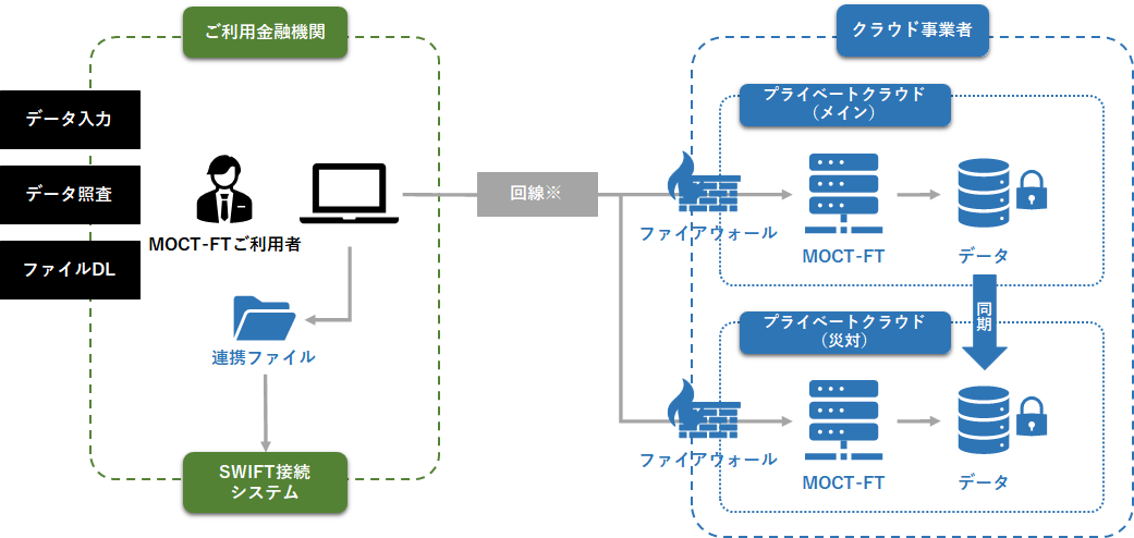 国際送金業務は、金融機関における重要業務です。障害発生や不測の事態に備え、 MOCT-FTはクラウド基盤の利点を活かして災対環境を標準で用意、本番環境と災対環境での自動同期も実現しています。障害等が発生しても、自動で環境が切り替わり業務継続ができます。