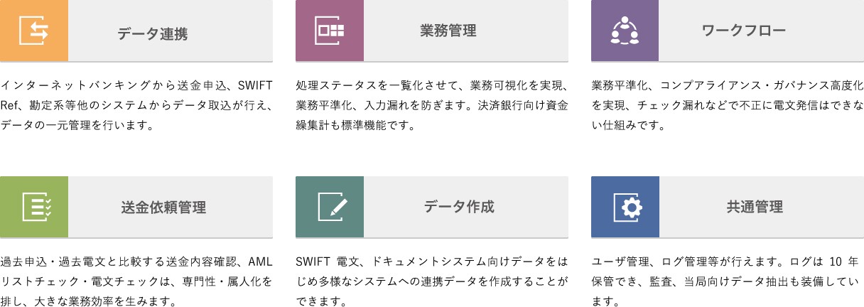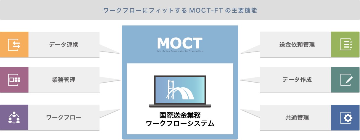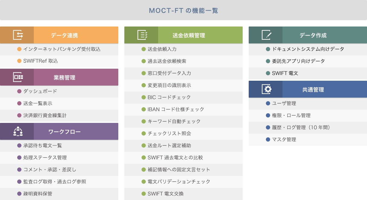 MOCT-FTは、国際送金業務の効率化とデジタル化を支援するクラウドサービスです。金融機関の国際送金業務フローに沿った設計により、現行業務を大きく変えずに導入でき、法令対応やBCP対応にも柔軟に対応します。以下の6つの機能カテゴリにより、業務全体を包括的に支援します。