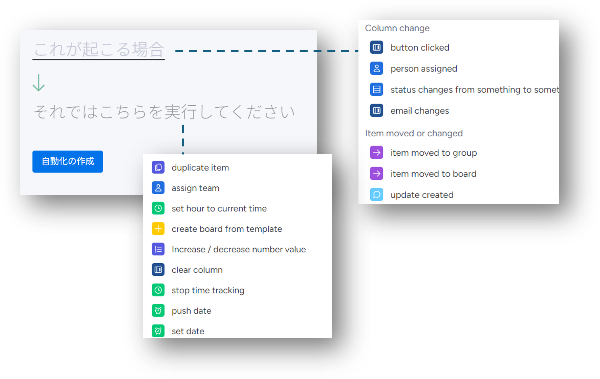 プロセスを自動的に実行するように monday.com に組み込むノーコードの機能です。トリガーが発生するたびに (たとえば、「新しいアイテムが作成されたとき」)、指定したアクションが実行されます。